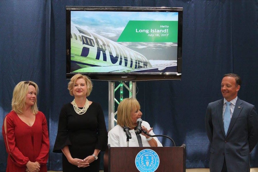 Top: Islip Town Supervisor Angie Carpenter announcing the expansion of Frontier Airlines at a press conference July 18 (Facebook).