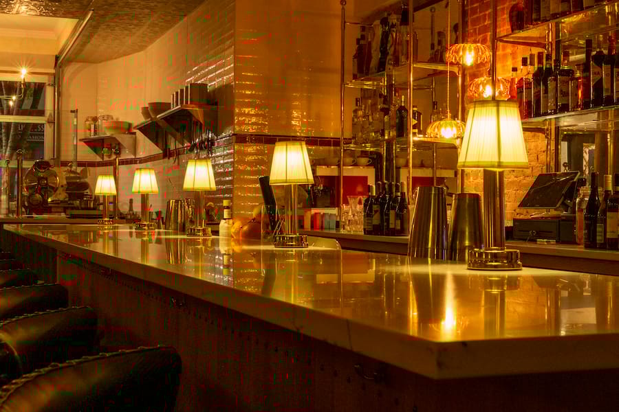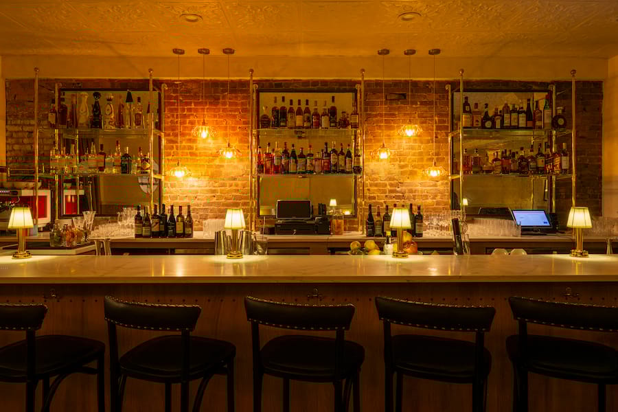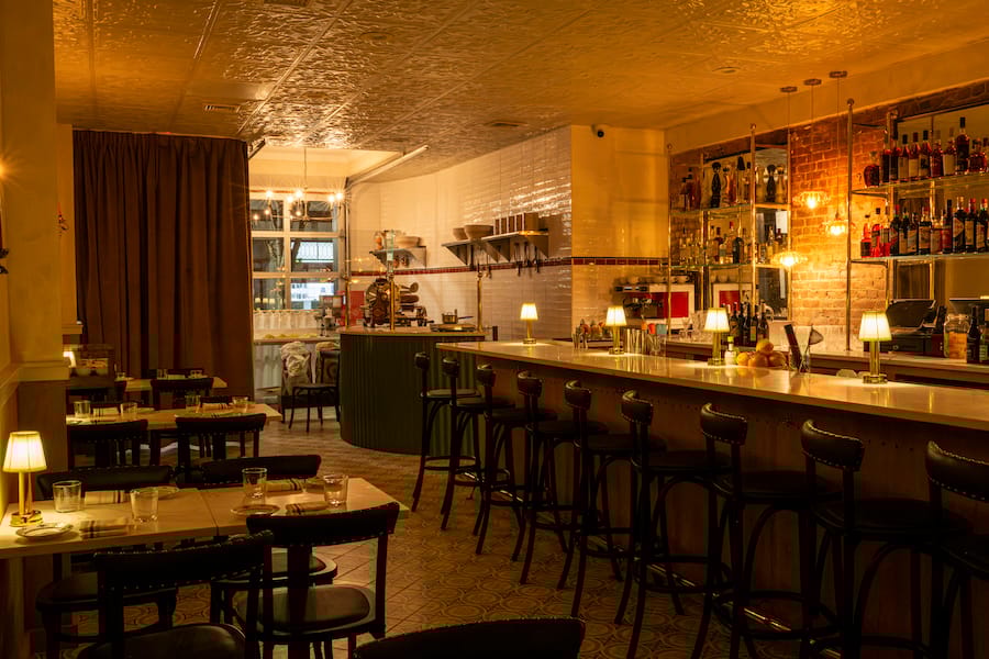 The warm and welcoming space is all exposed brick, marble table tops and candle light.