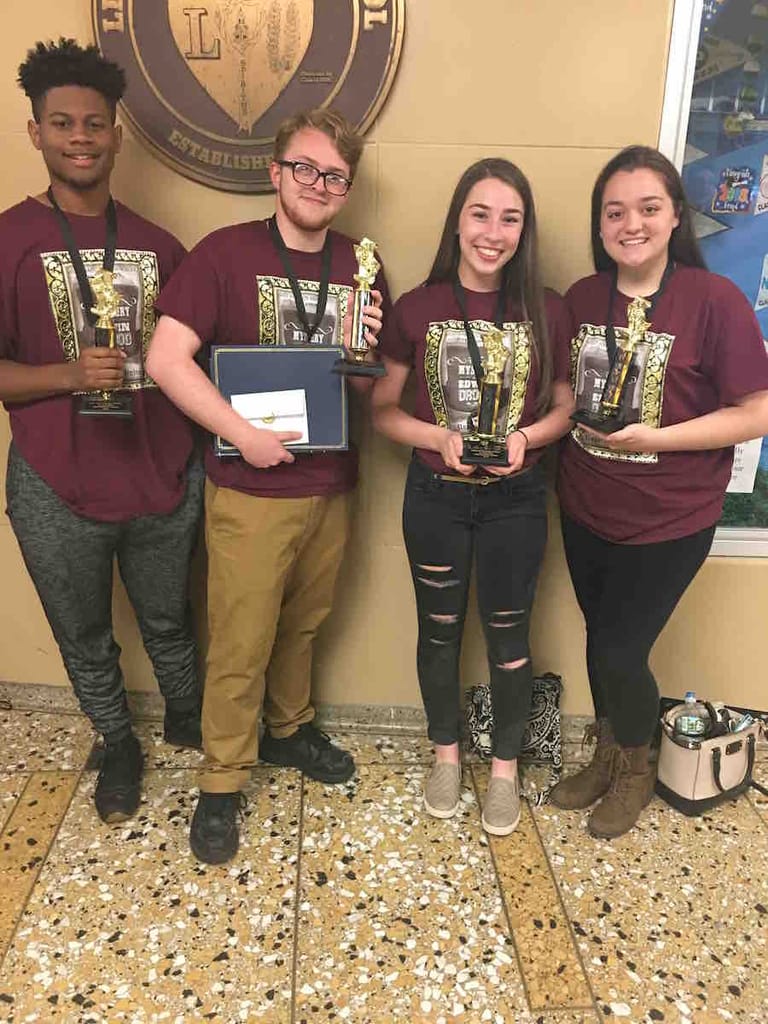 Top: (L-R) West Babylon Senior High Schools award winners David Grant, Colin Murray, Mackenzie Grimes, Danielle Del Orfano. Photo courtesy of West Babylon School District.