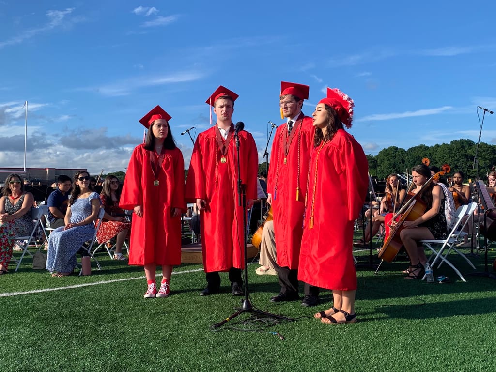 Aiden Gomez sang “The Star-Spangled Banner” and the vocal quartet of Michaela Fitzsimmons, Isabelle Irizarry-McAdam, Jake Kilrain and Daniel Locke delivered a heartfelt rendition of the school’s alma mater, while the school’s American Sign Language class offered interpreted versions.