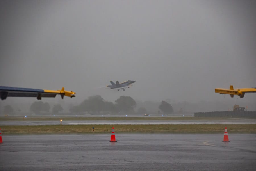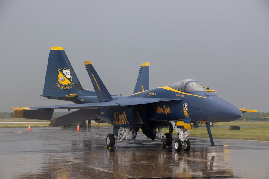Despite stormy weather, the Blue Angels’ F/A-18 E/F Super Hornets thrilled onlookers at Farmingdale’s Republic Airport when they arrived Thursday morning.