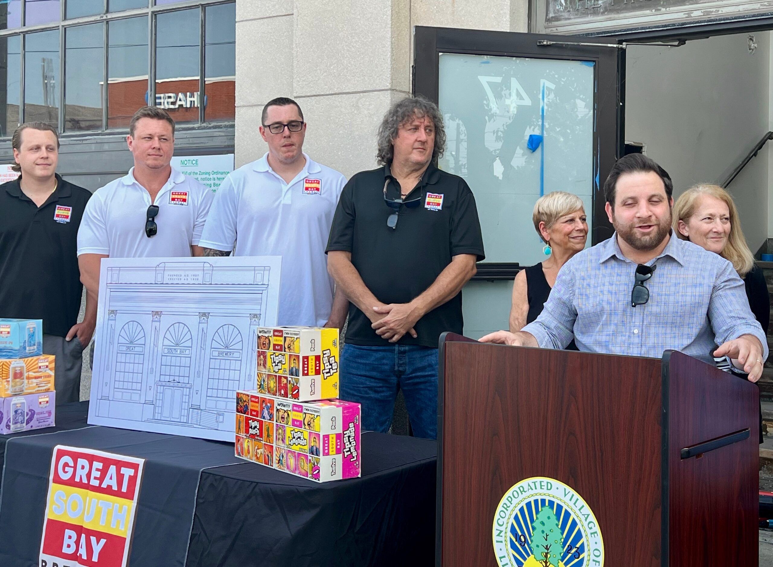 Top: Deputy Mayor RJ Renna and other village and town officials welcome Great South Bay Brewery and the Davis family (left) to downtown Lindenhurst. (Michael White)