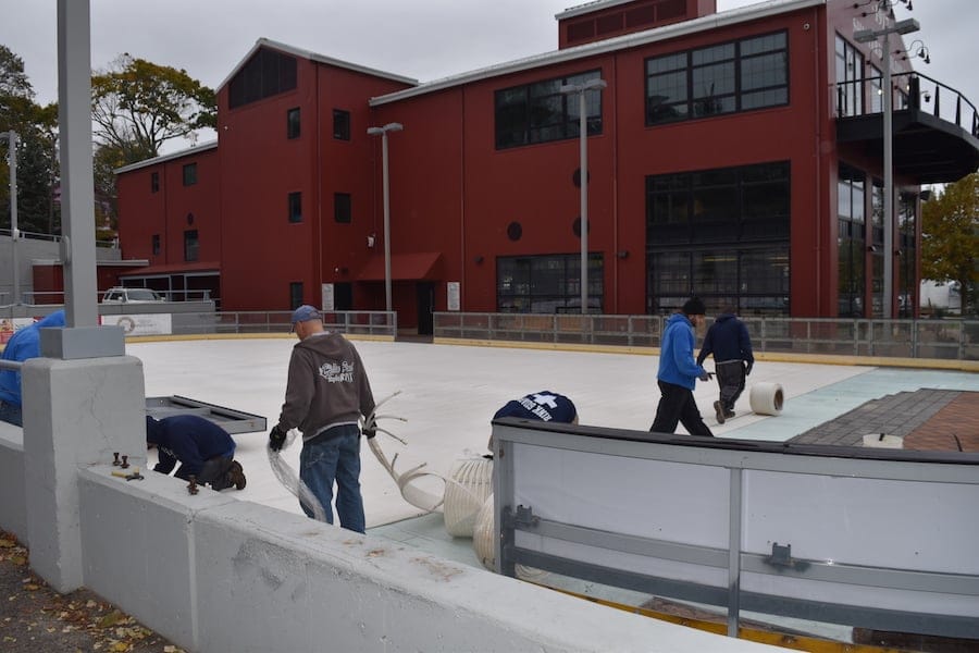 Top: The Rinx crew setting up the ice skating rink on Tuesday, Nov. 7, in downtown Port Jefferson near the Village Center. (Credit: Nicholas Esposito)