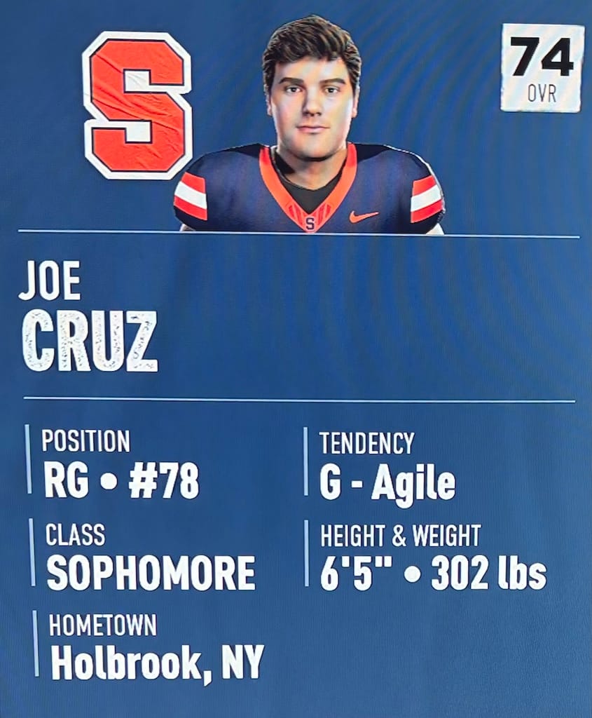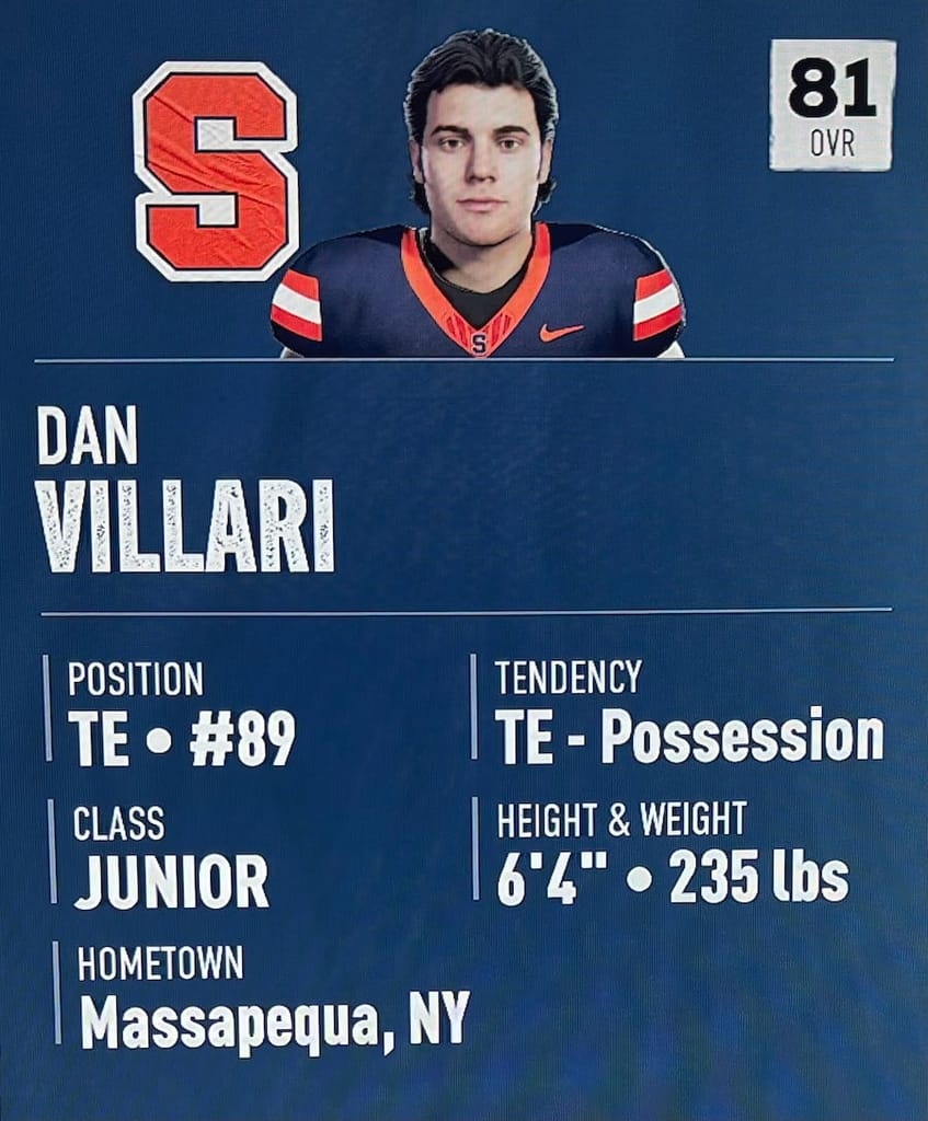 The game features a total of 14,000 student athletes, with at least 15 hailing from the Island. Three play for Rutgers, three on Syracuse, two on Penn State and one each on Army, Notre Dame, Charlotte, Marshall, South Alabama and UNLV. So far, the highest rated is Massapequa’s Dan Villari, who lines up as both a tight end and wildcat quarterback for the Orange. He’s listed as an 81 overall (out of 100).