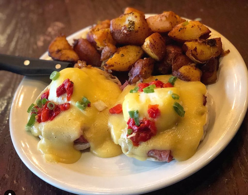 Consisting of two organic poached eggs served on toasted English muffin with grilled ham, roasted red pepper, green onions and topped with creole style hollandaise sauce.