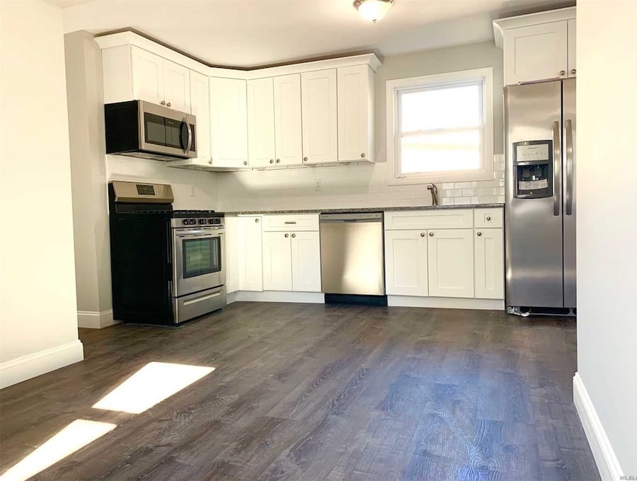 The house is newly renovated with three bedrooms and two bathrooms, including an updated kitchen with granite countertops and stainless steel appliances. There is also a carpeted basement.