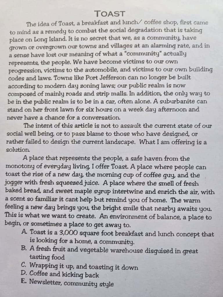 Eventually, word of the success of what was eventually renamed Toast Coffeehouse reached Patchogue Mayor Paul Pontieri, who would take field trips to the North Shore to dine at Toast.