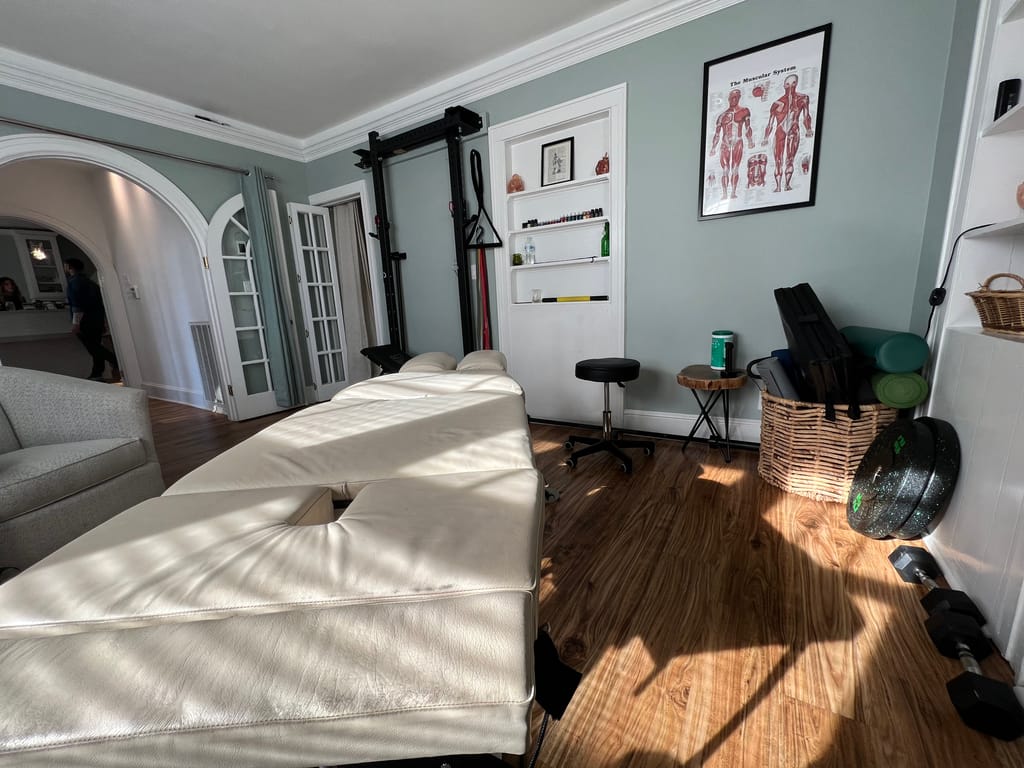 Dr. Dill says he starts his sessions with a little bit of massage, but always suggests a full hour of professional massage beforehand, deep tissue if needed, or acupuncture to release necessary tension — before he gets to work.
