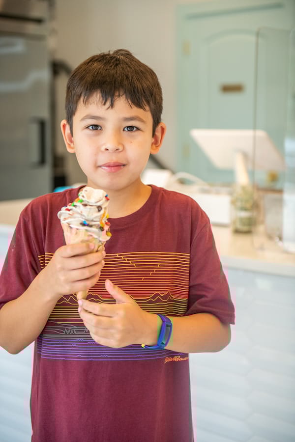 When putting together a bubble waffle cone, customers choose an ice cream base made in-house and then the mix-ins, like cereal, fruit, granola, chocolate, and more.