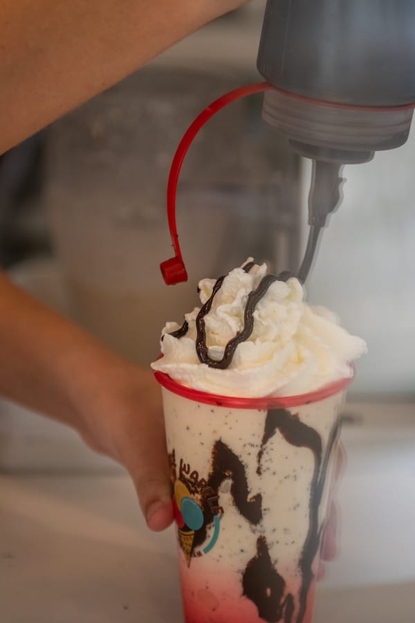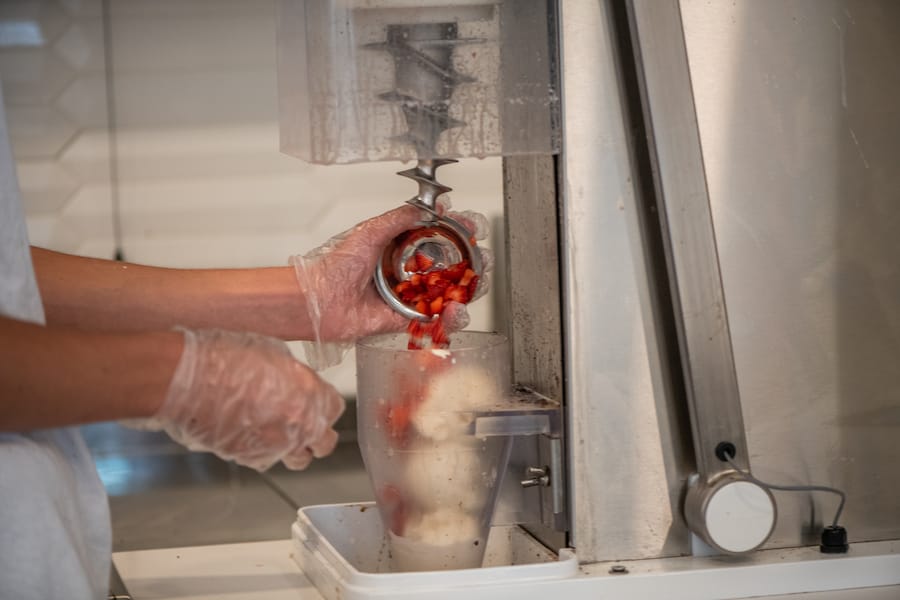 The flavors are infused with a drill-like tool, rather than just putting the add-ons all on top. For example, if someone wants strawberry ice cream, it would be vanilla ice cream-based and strawberries infused.