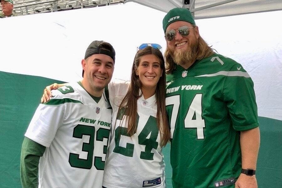 Top: Matthew Gervasi and Ashley Castanio-Gervasi with her all-time favorite Jets player, the late Nick Mangold. (courtesy photo)