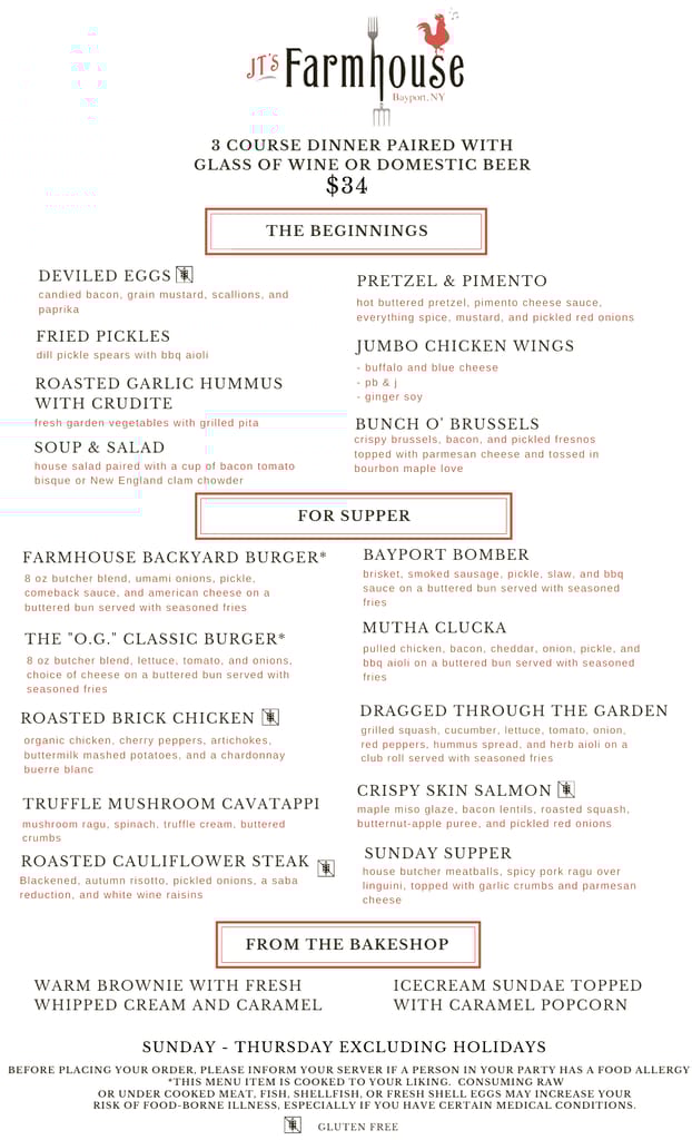 The Farmhouse is also running a first-ever prix fixe menu, which is now available for $34 Sunday through Thursday, and a complimentary glass of wine or domestic beer is included in the app, entrée and dessert deal.