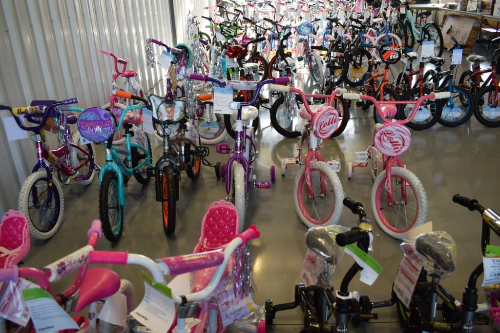 Hundreds of bicycles for kids of all ages lined the back wall, while Barbies, baby Yodas, sneakers, board games and play sets were placed upon nearly a dozen different tables, all up for grabs.