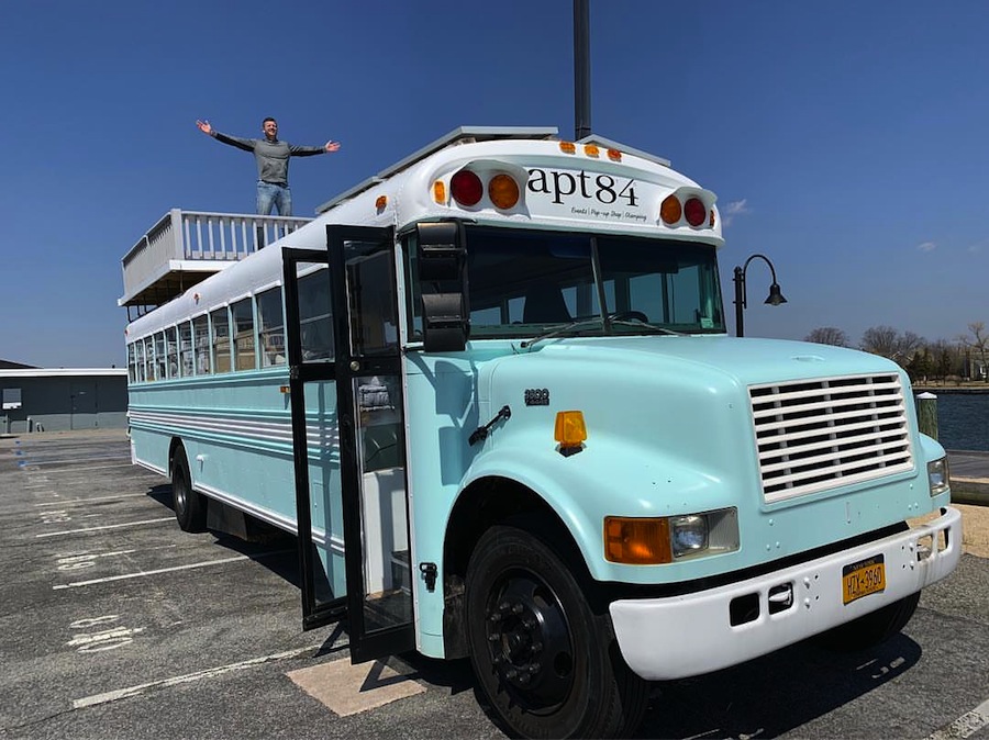 We’re talking about Long Island’s first traveling “skoolie” named Apt. 84. For the uninitiated, a skoolie is a bus that has been converted and repurposed, mostly for tiny home purposes.
