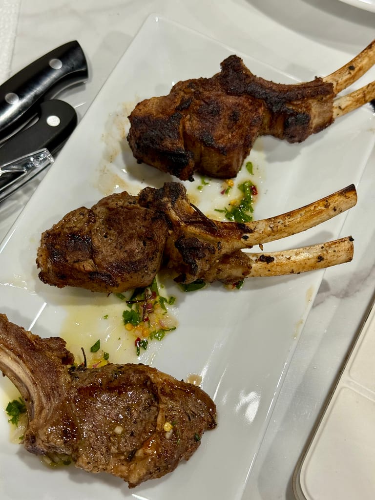 That balance shows up in signature items like jerk wings, pepper shrimp, salmon, and Nicole’s go-to — lamb chops, cooked the Lionz Den way.