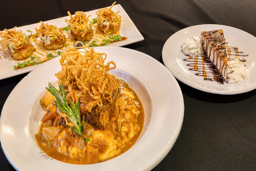 Prix fixe! Spicy tuna rice cakes (background), short rib (foreground) and house-made Snickers cheesecake. (Credit: Eric Micallef)