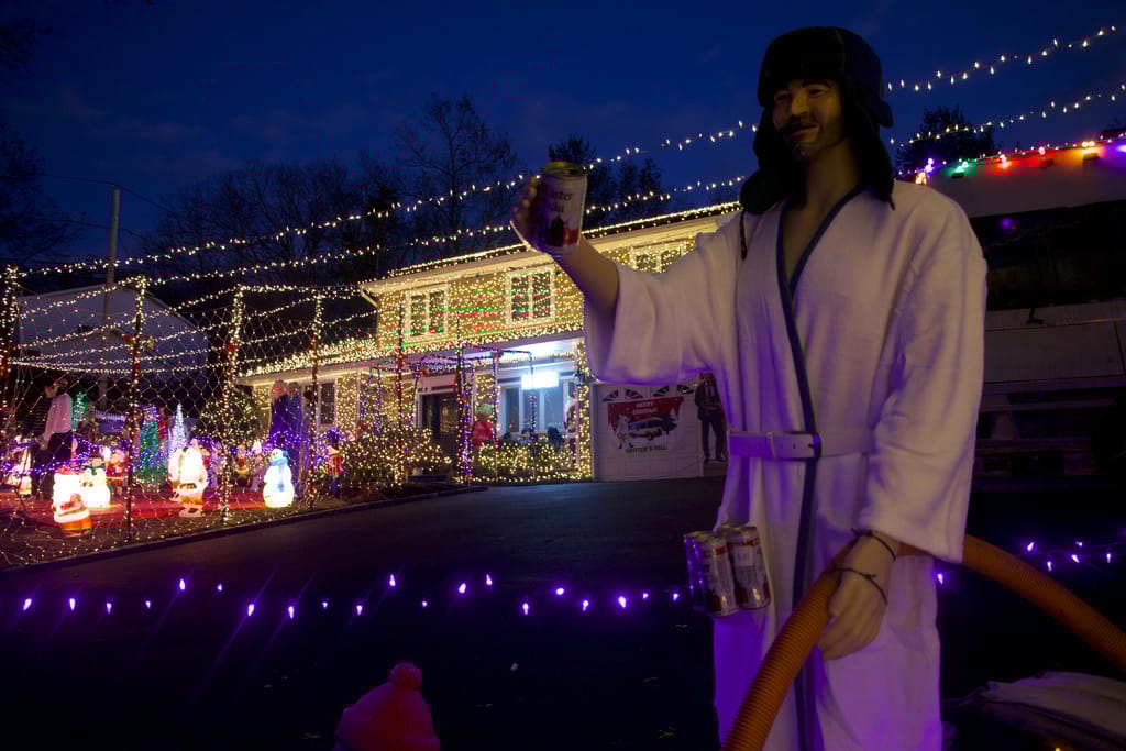 Other highlights include a life-sized Clark Griswold figure tangled in a string of Christmas lights and hanging from the roof’s edge, and animated to continuously scream “Help! Help!”