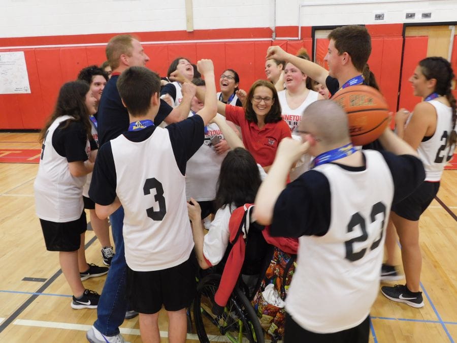 Rules align with school basketball — the only difference is that at all times on the court, there must be three students with a documented intellectual disability and two general education students. The blend results in incredibly special mentoring relationships.