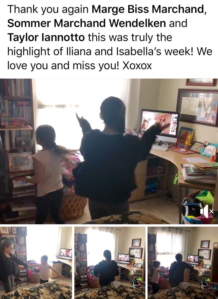 “Thank you again Marge Biss Marchand, [instructors] Sommer Marchand Wendelken and Taylor Iannotto,” parent Jennifer Gonzales wrote on Facebook, along with pics of her girls dancing at home. “This was truly the highlight of Llianna and Isabella’s week! We love you and miss you! Xoxox”