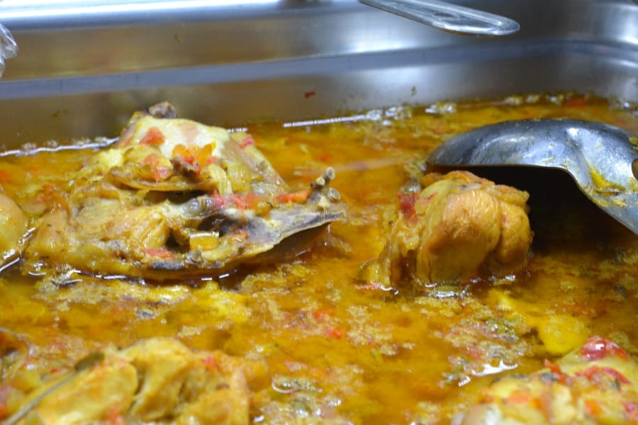 Behind the counter are hot trays filled with sancocho stew with pork and roasted potatoes; chicken in salsa de mani or peanut sauce; and chicharrón de pescado, small curly pieces of fried fish.