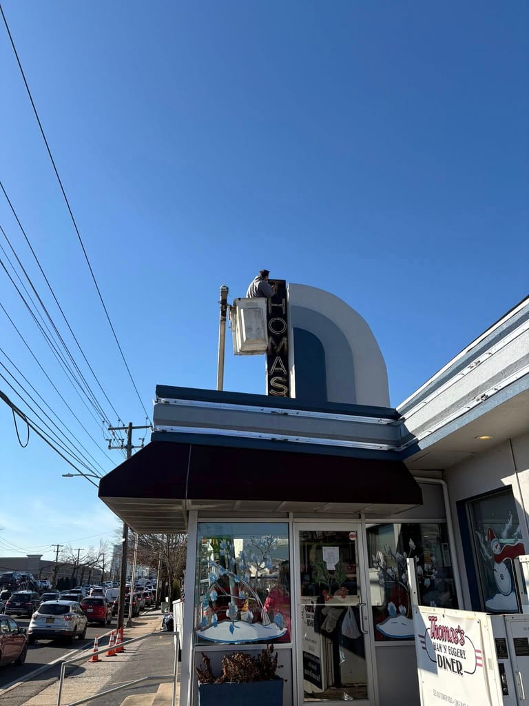 The Thomas’s Diner sign with the ‘T’ and ‘M’ out last week (L). The fixed neon Monday afternoon (R). (courtesy photos)