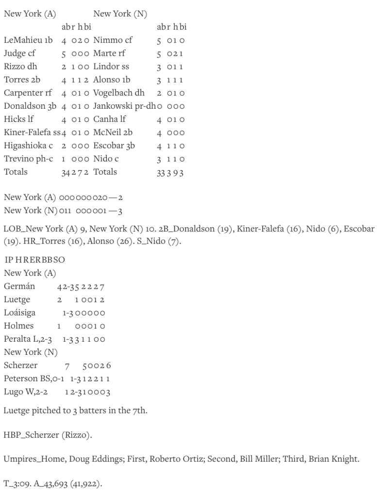 The Mets extended their NL East lead to three games over Atlanta with their seventh victory in the last nine meetings against the Yankees. This series marked only the second time the city rivals were both in first place when they squared off — the other came in April 2015.