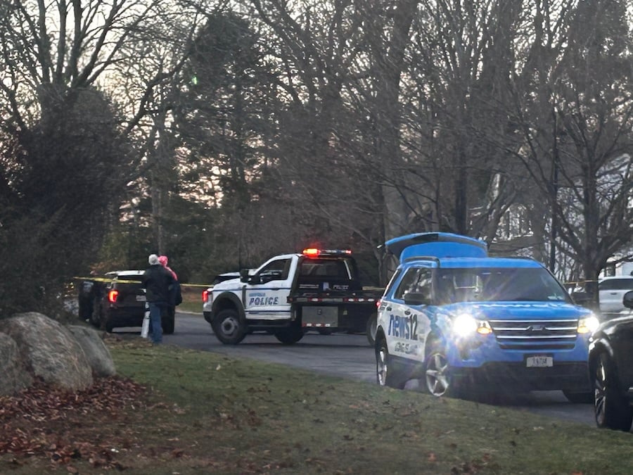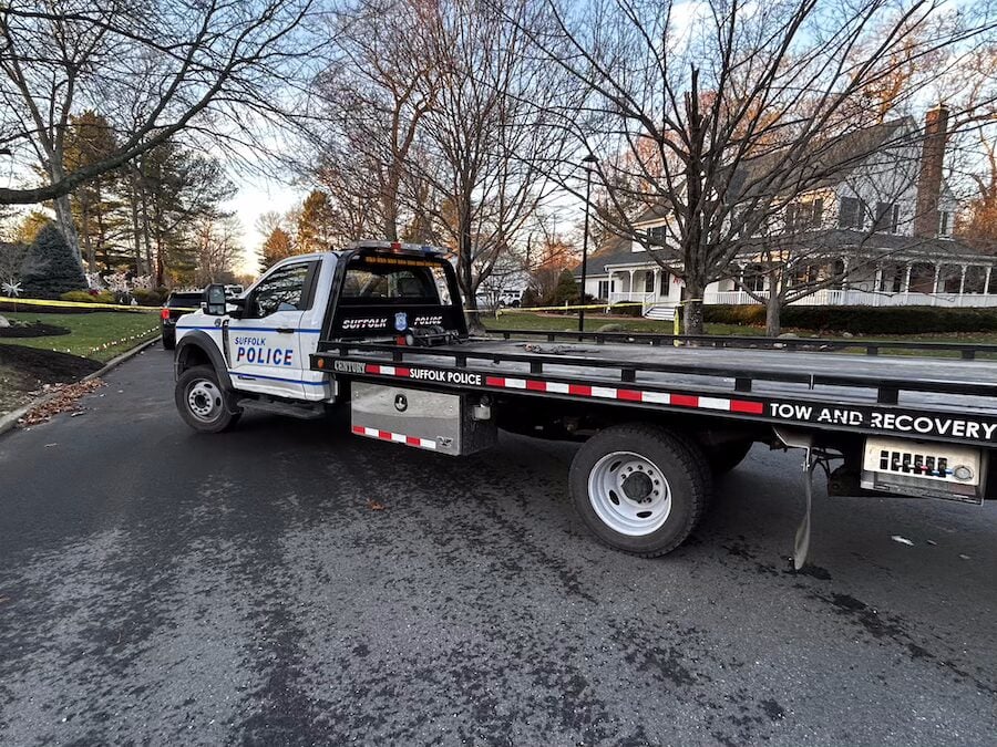 A Suffolk County police flatbed tow truck arrived about 3:45 p.m. and removed the Ram, leaving the area just before 5 p.m. Two Suffolk Crime Scene Section vans also departed around 4:40 p.m.