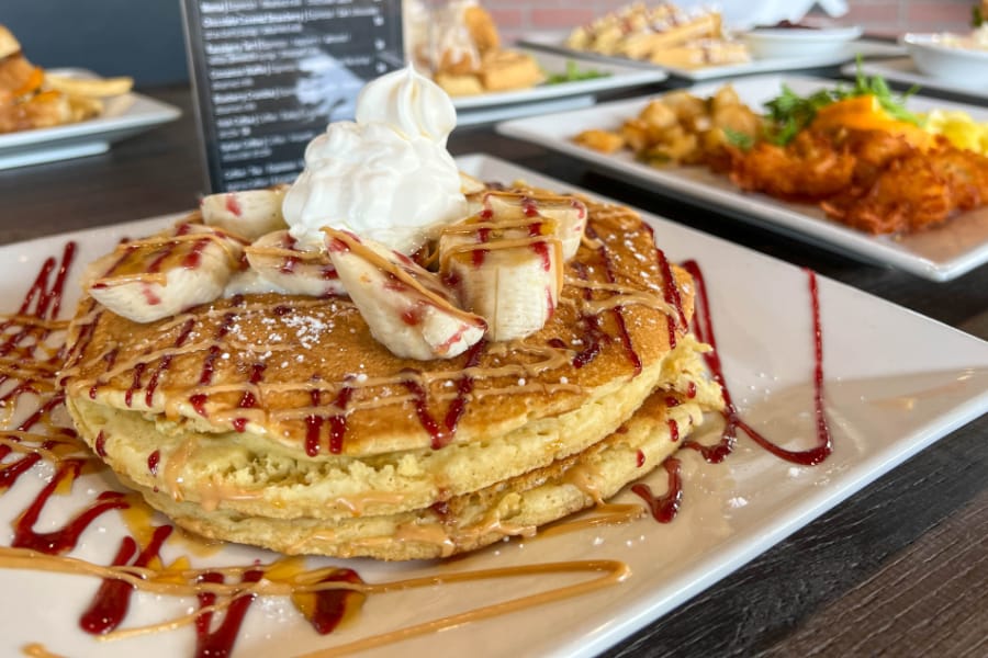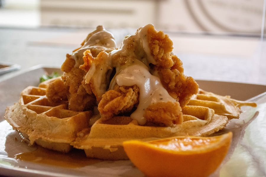 The breakfast and brunch menus are rounded out with various omelets and pancake stacks, as well as the chicken dance — the eatery’s chicken and waffles with sausage gravy and a maple drizzle.