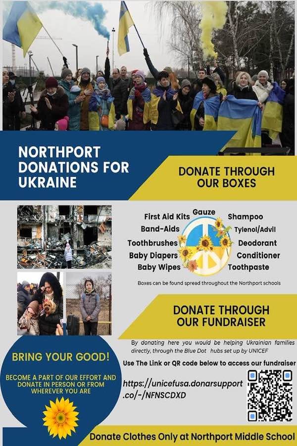 Each of the district’s schools are accepting donations for Ukrainian refugees, including medical supplies, hygiene products and clothes that can be brought to Northport Middle School.