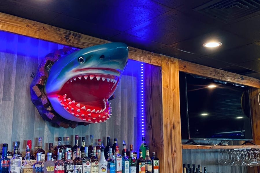 “We’ll have bucket specials, 5 domestic bottles for $20, 5 imports for $30,” Dugan said. “And we’ll have discounts on food in our bar area.” The game will be played at the bar, next to the massive shark head chomping through the mirror.