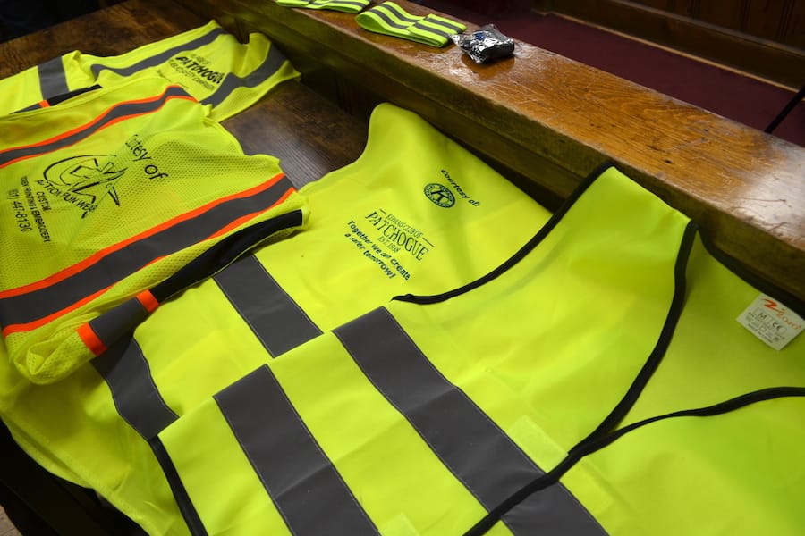 Fifteen private businesses, unions, non-profit organizations, and service groups donated over 1,000 vests, armbands, and lights, which were distributed over the past month by the Suffolk County Police Department’s CODE Unit and the Patchogue-Medford Library.