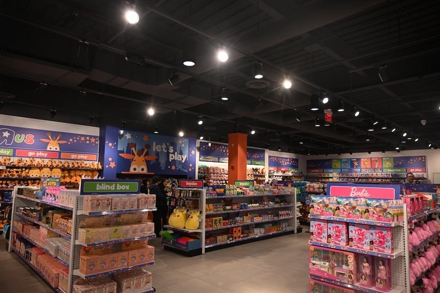 The store, operated by Go! Retail Group, takes over the former Forever 21 space and brings back all the nostalgia: towering displays of LEGO sets, Barbie collections, Hot Wheels tracks, NERF blasters, Paw Patrol, and more. Kids and adults alike were greeted by a massive Geoffrey the Giraffe set-piece for photo ops, one of several interactive spots throughout the new shop.
