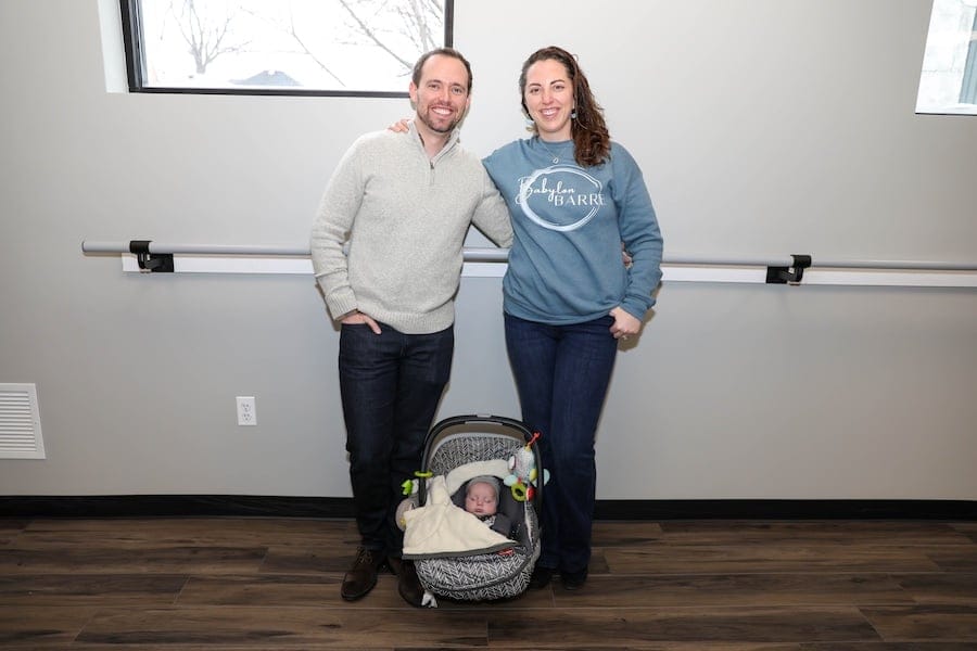 Top: Babylon Barre & Pilates owners are husband-and-wife team Kelly Peckholdt and Kevin Flood. Here’s them together inside the fitness studio with their baby Everett. (Courtesy)