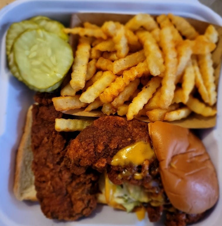 Dave’s #3 is one tender and one slider with fries, which is served with kale slaw, pickles, Dave’s sauce, and sliced bread.
