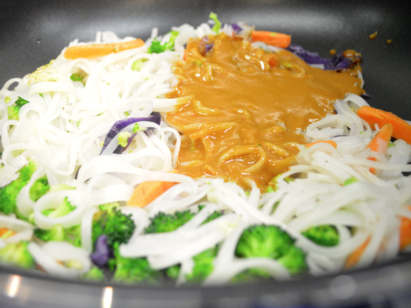 4. Drop in two scoops of peanut sauce and toss (while in a second pan).
