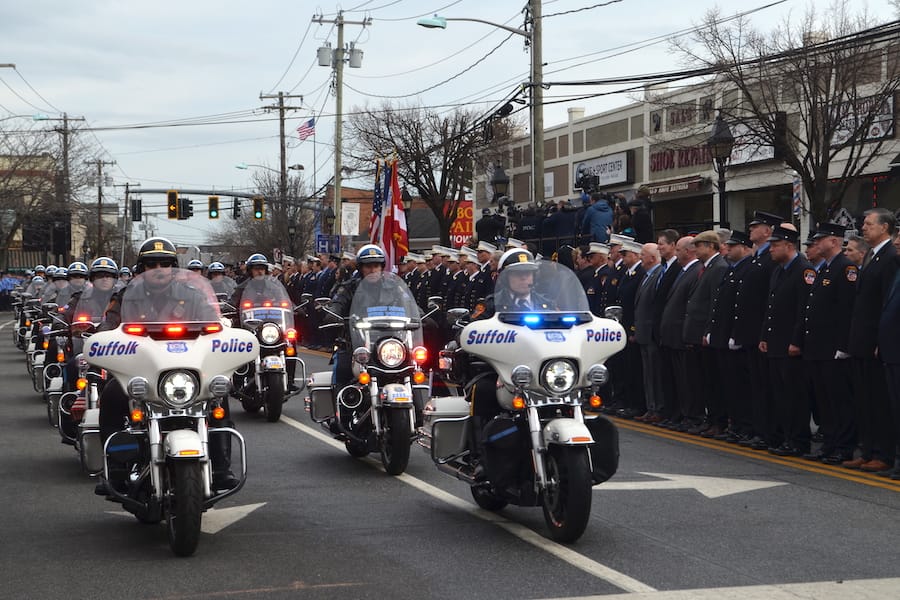 The funeral procession commenced at Chapey’s Funeral Home in East Islip and emergency vehicles drove down Montauk Highway to the church steps.