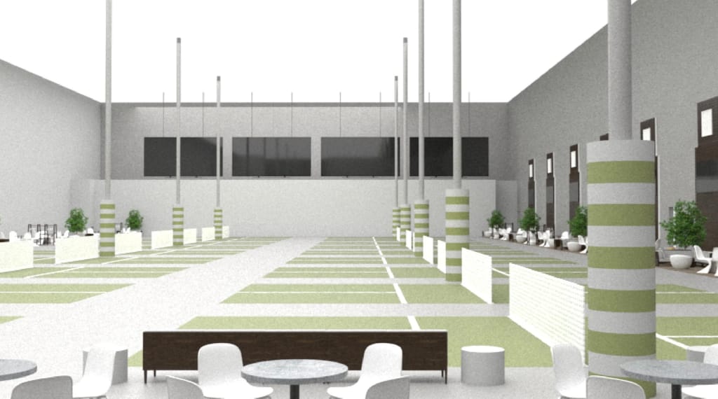 Each court will have its own lounge area, featuring cozy couches and chairs, a table and a 90-inch television that will offer interactive instant replays of the action on the court. Additionally, the venue will feature giant, rear-projection movie theater screens in the back of the building, allowing players and more casual customers in the bar area to watch sports and other events.
