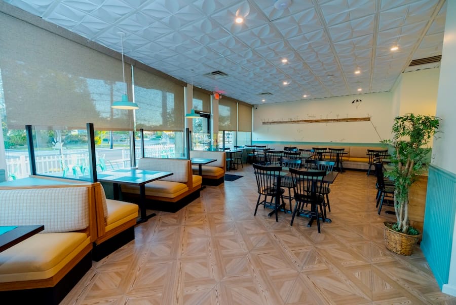 The restaurant features a spacious dining area with seating for 100 guests inside and 50 more outdoors.