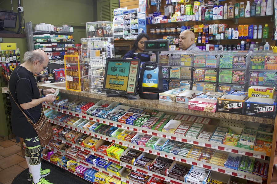 A few minutes later, another customer plunked down $100 for Wednesday’s drawing, leaving with a fat stack of tickets. The same guy spent $50 on Mega Millions tickets.