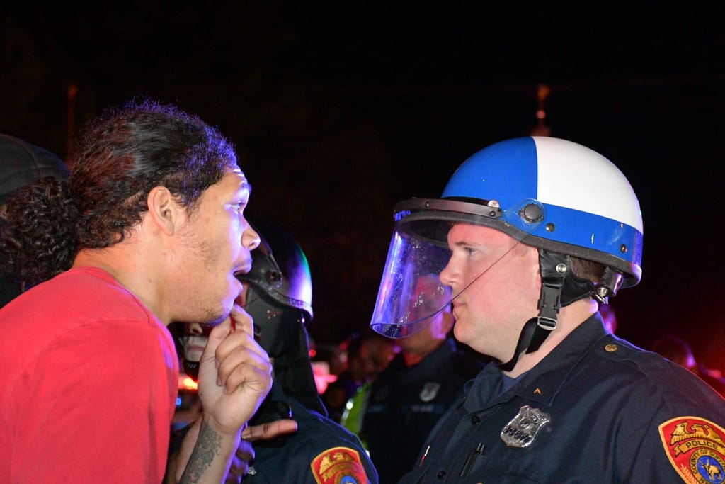 A brief scuffle broke out between one protester and a police officer. It was not clear how it started, but the protester promised to return. Most officers either tried to calm protesters or remained stoic amid taunts.