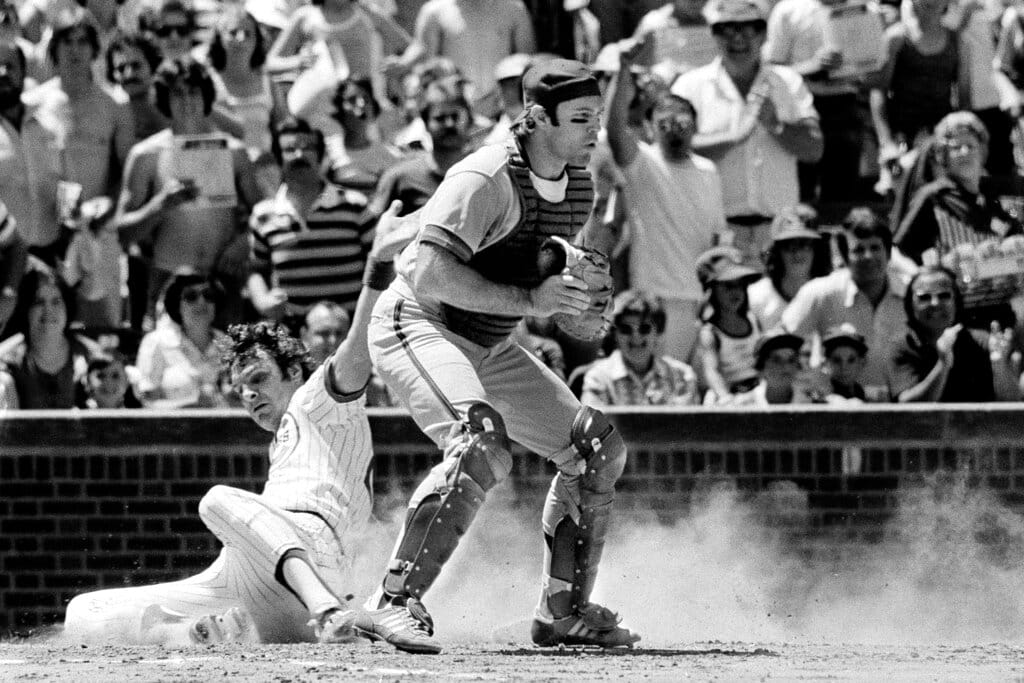 FILE – Chicago Cubs first baseman Larry Biittner scores behind New York Mets catcher John Stearns during the first inning of a baseball game in Chicago, on June 26, 1978. . Stearns, a four-time time All-Star catcher with the New York Mets, has died after a long battle with cancer, the Mets announced Friday, Sept. 16, 2022. He was 71. (AP Photo/Larry Stoddard, File)