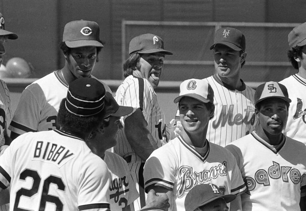 Philadelphia Phillies Pete Rose, center, expresses a thought during the National All Star League picture session as Atlanta Braves Dale Murphy, second from right, and New York Mets John Stearns, top right, prepare their smiles before the 51st All Star game, Tuesday, July 9, 1980, Los Angeles, Calif. The rest of the players are unidentified. (AP Photo)