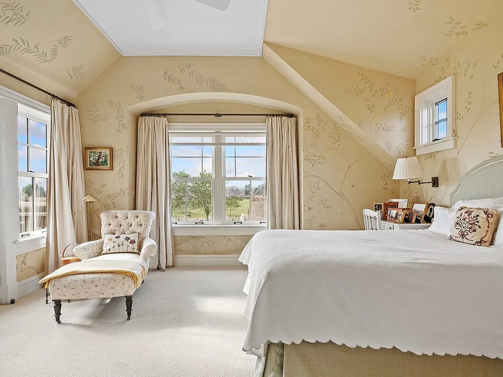 The grand master suite is a private sanctuary, complete with a spa-like ensuite bath, walk-in closet and a romantic terrace overlooking serene Hamptons farmland.