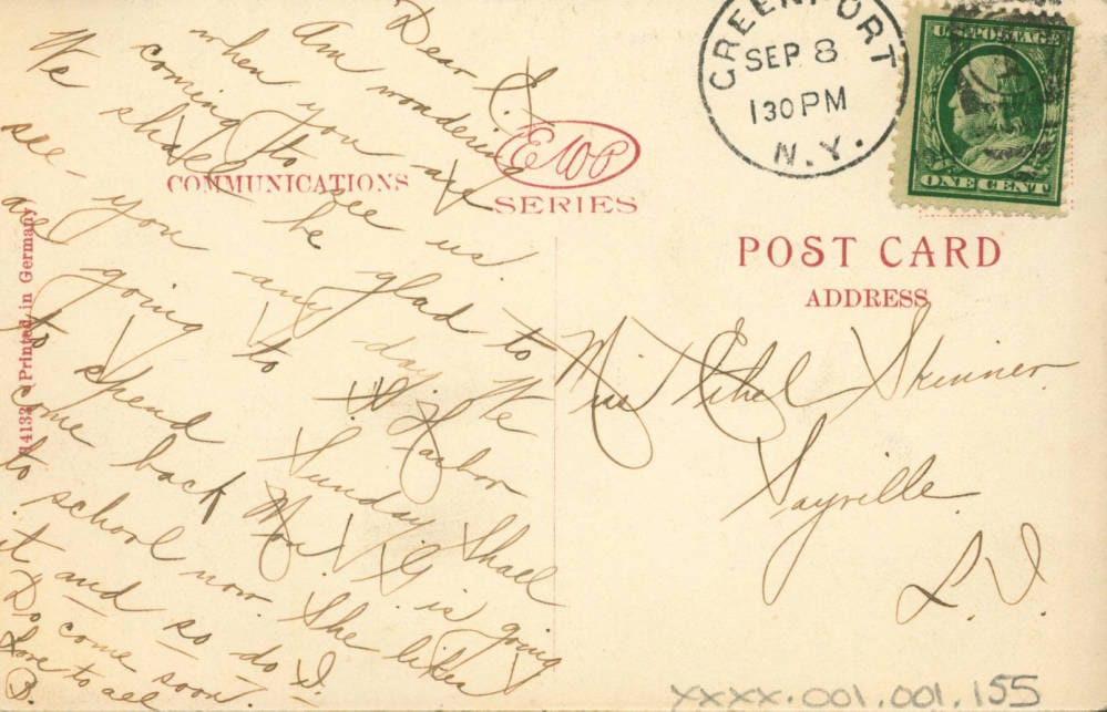 Blanche sent one from Sayville to Brooklyn in 1903 that simply said she’d be home “Tuesday afternoon about six o’clock.” And “Joe and Abe” wrote from Sayville to Elizabeth in Garfield, New Jersey, in August of 1915 that they had seen an “aroplane” fly about 500 feet over the bay where they were sitting.