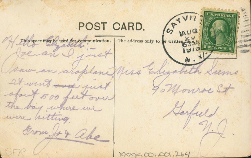 ’Aroplane’ flies over Sayville Creek — 1915