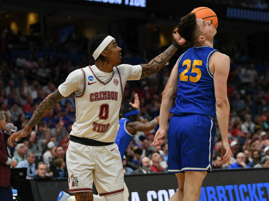 Top: Long Island native Preston Edmead driving with the ball against Alabama in the 2026 March Madness Tournament. (Credit: Justin Cohen Photography for Greater Long Island)