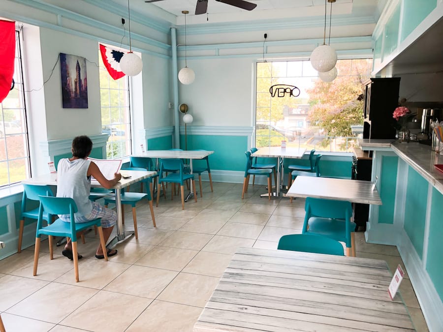 There are lots of windows letting in sunlight. The walls are painted teal and white, adorned with decorative molding that gives it a modern almost beach house atmosphere. Behind the counter an old brick oven is painted all black. And the kitchen is hidden away, unlike most Chinese takeout restaurants where the magic happens right behind the cash register.