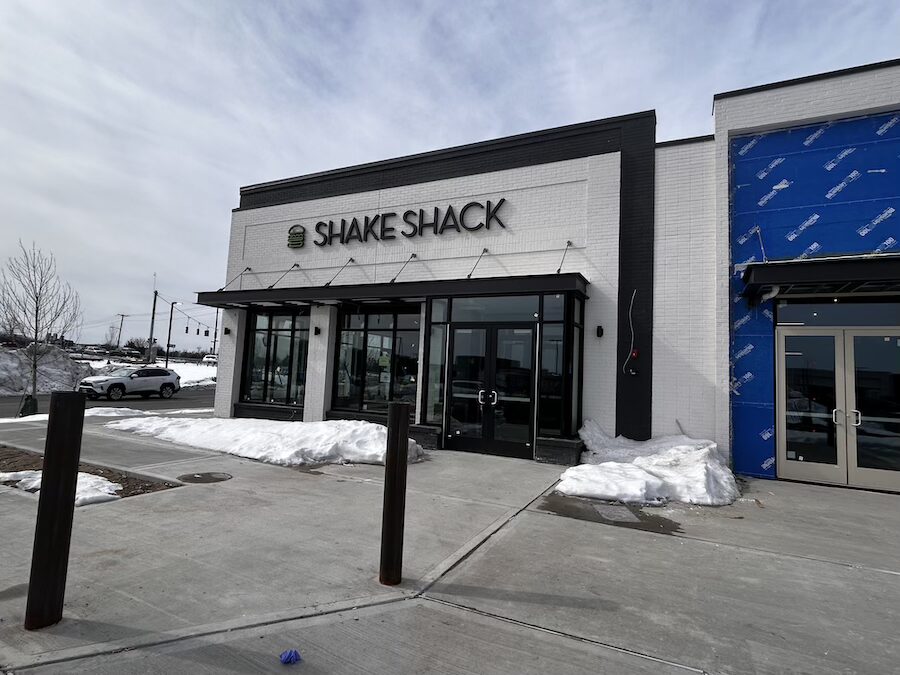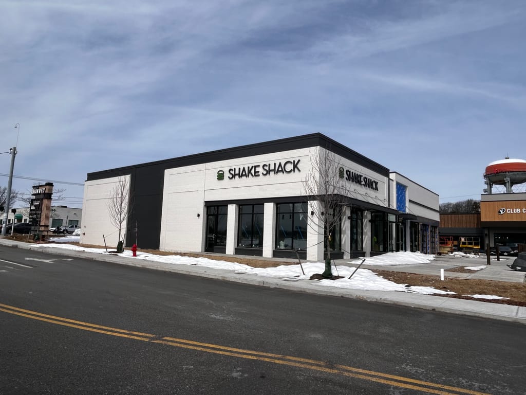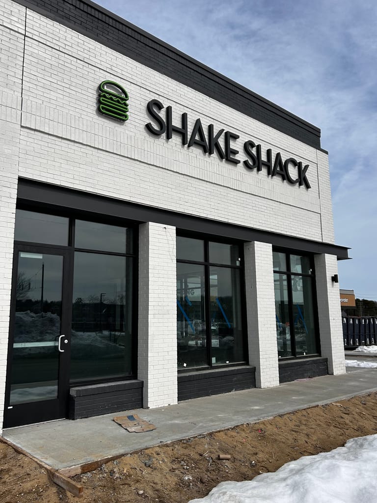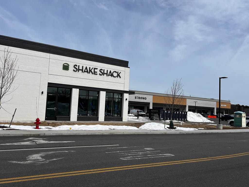 Shake Shack is taking shape at The Shops at SunVet in Holbrook, with its exterior — decked out in the chain’s signature green-and-black branding — largely finished while crews continue work inside.