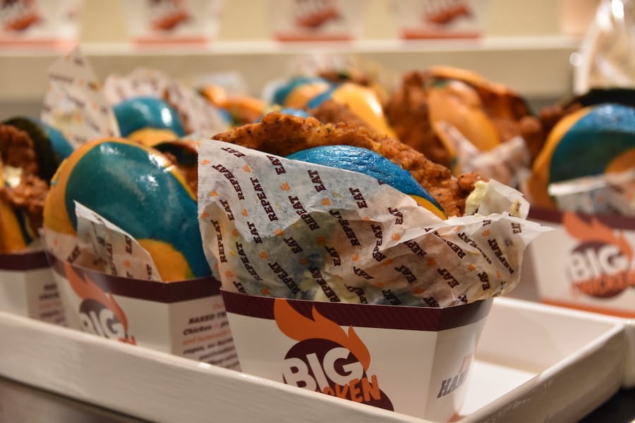 It’s a crispy chicken sandwich topped with cream cheese and blue cheese on a blue and orange colored bagel