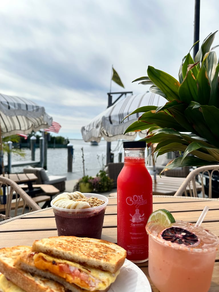 Featured above is the Cali BEC, a California-style bacon, egg and cheese grilled between two sourdough slices with tomato, cheddar cheese, chipotle cream sauce, scrambled eggs and bacon jam. Alongside the Cali BEC is an açaí bowl, Swell’s Blood Orange Margarita and and OM Organics watermelon and mint fresh-pressed juice, made locally.